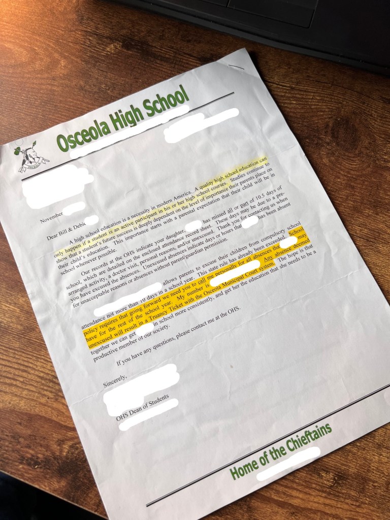 We were under no illusions that once our older children left for the university, we would be squarely in the fight to keep them grounded in sanity (and concentrating on their education). But that was YEARS before the letter, and again, we were shocked to receive such correspondence from a High School. It left us to draw one simple conclusion; our “small-town, middle America” high school was staffed with bureaucrats that were attempting to wrest control and “Truancy Ticket threaten” us out of the role of being active participants in our child’s education. We could not let this stand